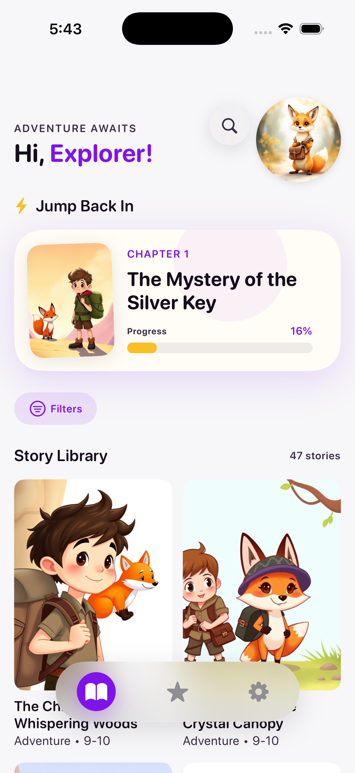 Every night, a new Choose Your Own Adventure story. You read together, they pick what happens next at every twist and turn. Scout the Fox guides the way in safe, AI-generated tales.